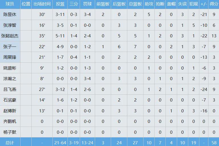 中国男篮全队只抢到27板,篮板球少了澳大利亚27个,只有一人得分上双,即张懿赵杰投篮11中5,得到13分5板1助2断。