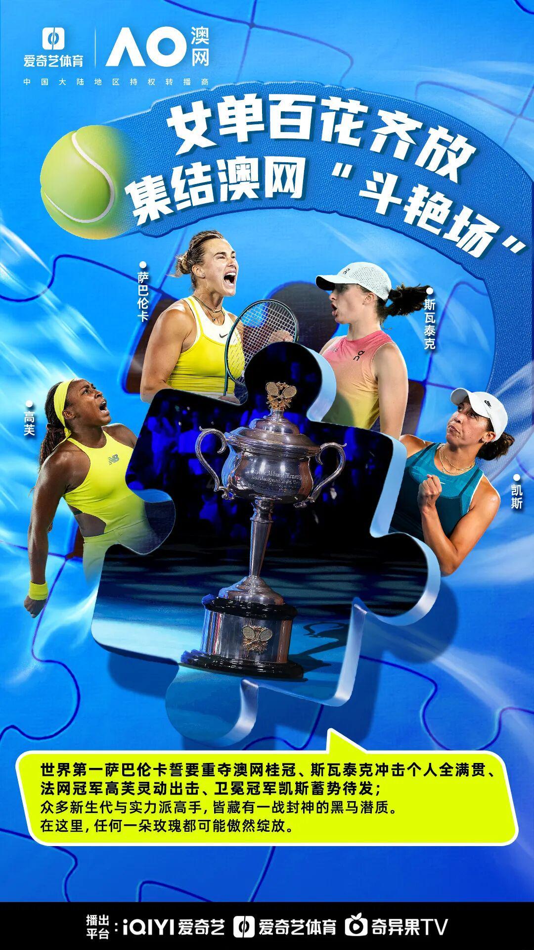 北京时间1月18日,新赛季首项网球大满贯——2026澳大利亚网球公开赛即将火热来袭,锁定爱奇艺体育,看2026澳网全场地直播!