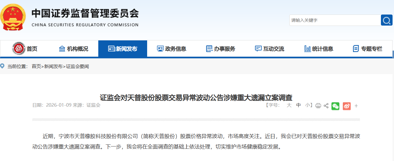1月9日,证监会官网发布公告,近期,天普股份(605255.SH)股票价格异常波动,市场高度关注。近日,我会已对天普股份股票交易异常波动公告涉嫌重大遗漏立案调查。