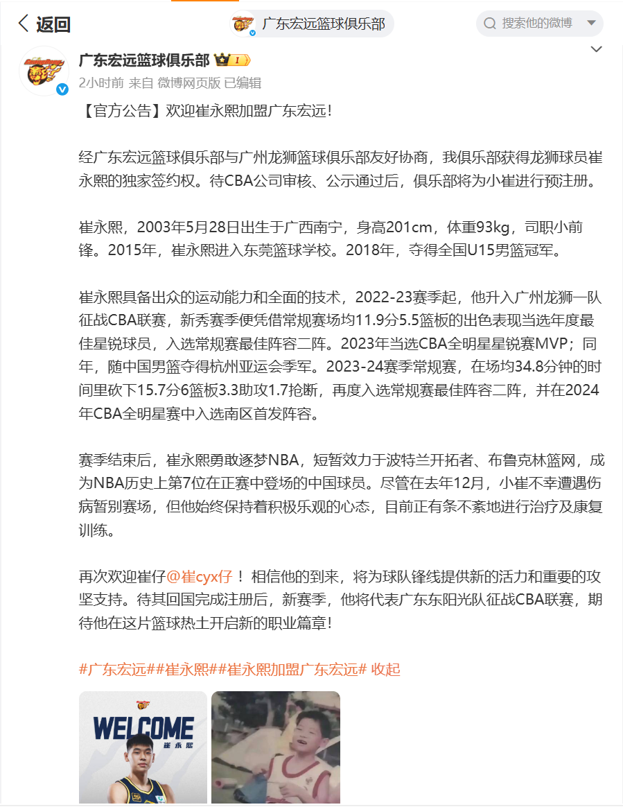 此后,崔永熙更新了个人微博,他晒出一组照片,其中就有一张他小时候穿宏远球衣的照片,并写道:“为宏远效力是我小时候的梦想,原来一切都有迹可循。我是从小看着广东宏远打球长大的孩子,难以想象会有这种奇妙的缘分将我CBA和NBA不同时期两个梦想联动在了一起。感谢广东宏远篮球俱乐部的信任,在我伤病康复的最后阶段坚定选择了我,给予了我很大的力量和信心!”