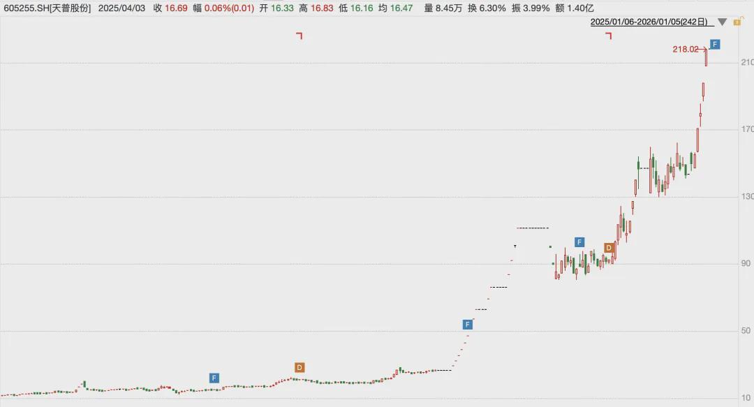 盘面上,天普股份自2025年12月31日起停牌,为近四个月第五次停牌核查。2025年,公司股价从年初12.59元/股涨至年末的218.02元/股,累计涨幅达1645.35%。