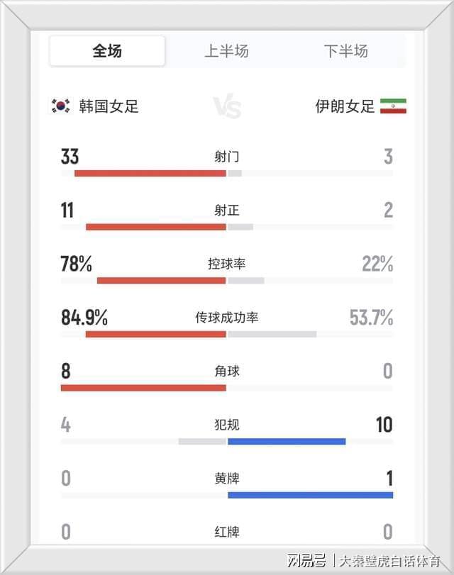 首先是射门次数方面,韩国女足狂轰33脚有11次打进球门框范围内,而伊朗女足只有3次射门,2次射门没有任何威胁。