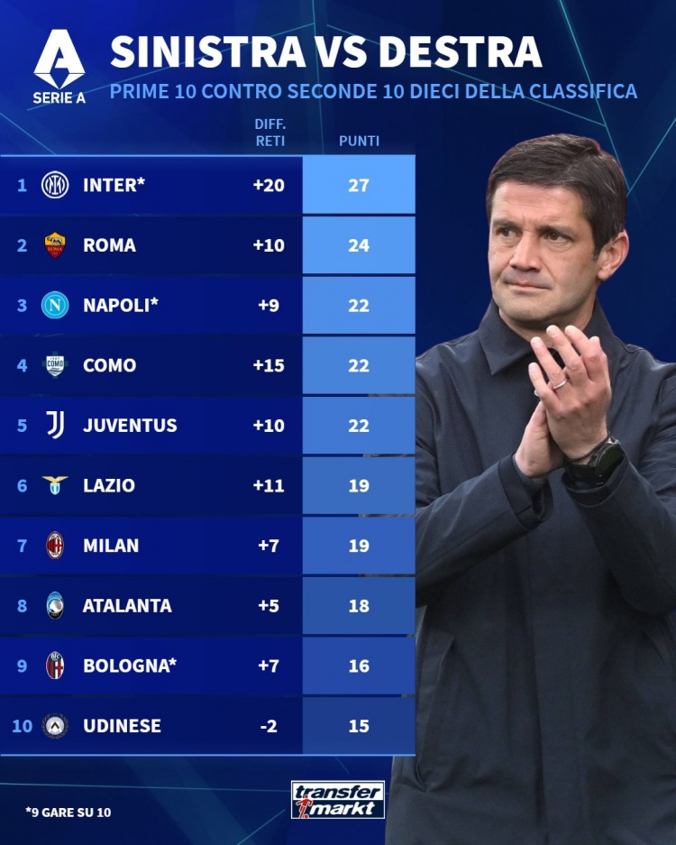 1月9日讯 德国转会市场统计了本赛季意甲前10球队对阵下半区球队的积分,并列出排名,国米27分居首,罗马24分次席。